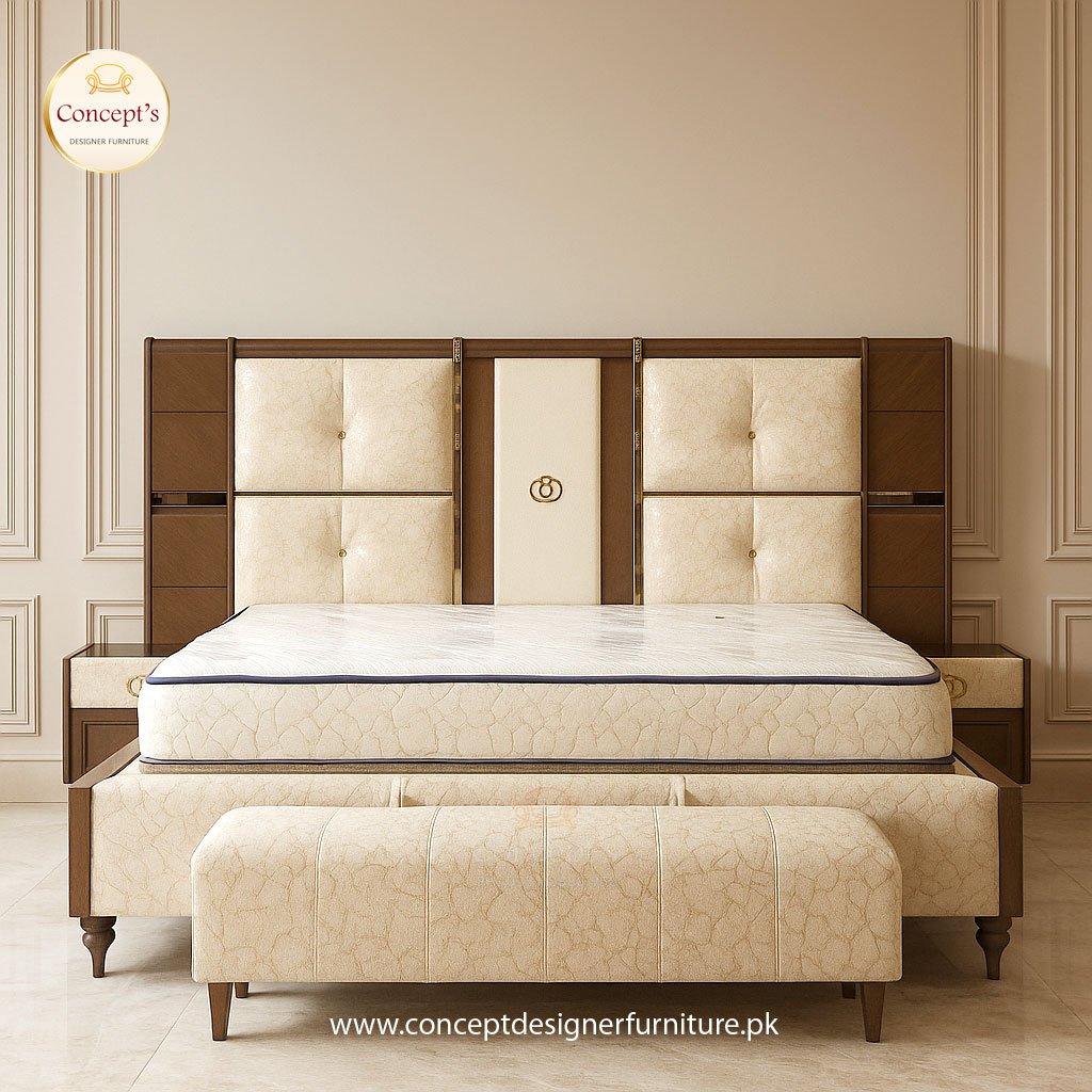 Elevate your bedroom aesthetics with the Modern Dream Weaver double bed, featuring side tables and a dressing area, by Concept Designer Furniture. You can also customize your desired fabrics used in this item.