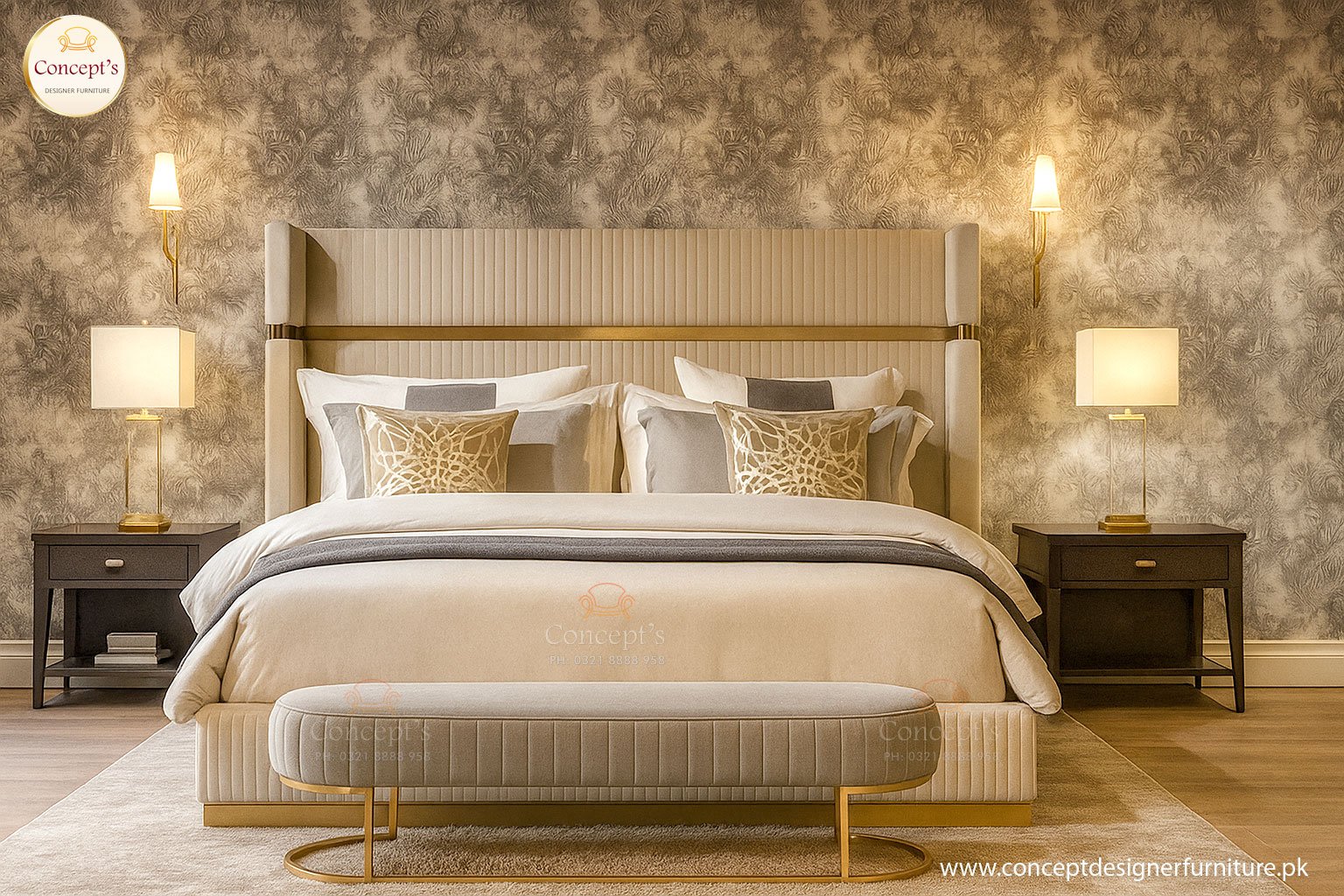 Elevate your bedroom aesthetics with the Modern Wing Double Bed with Side Tables and dressing by Concept Designer Furniture. You can also customize your desired fabrics used in this item.