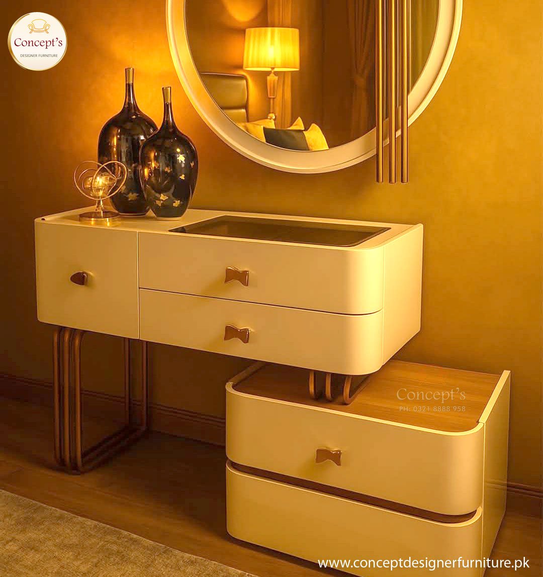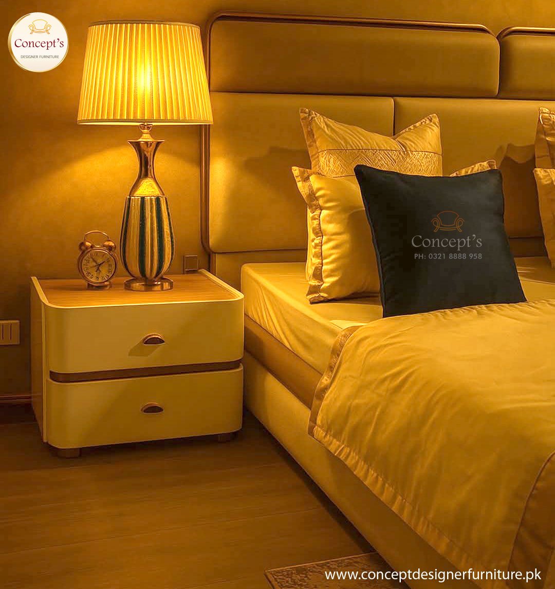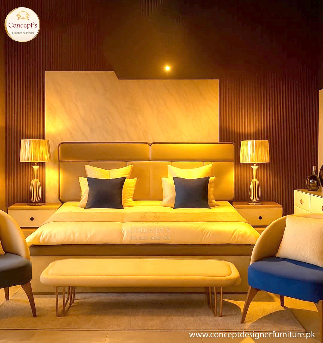 Elevate your bedroom aesthetics with the Modern Moonlit Harmony Bed with Side Tables and dressing by Concept Designer Furniture. You can also customize your desired fabrics used in this item.