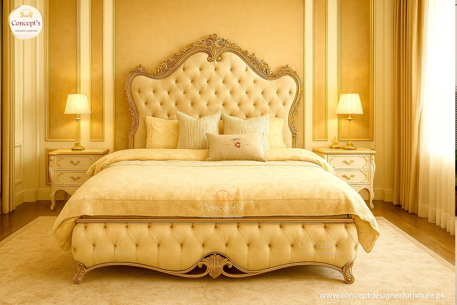 Elevate your bedroom aesthetics with the Modern Royal Comfort double bed, featuring side tables and a dressing area, by Concept Designer Furniture. You can also customize the fabrics you prefer for this item.